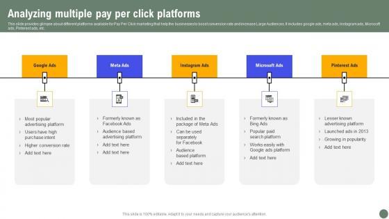 This slide provides glimpse about different platforms available for Pay Per Click marketing that help the businesses to boost conversion rate and increase Large Audiences. It includes google ads, meta ads, Instagram ads, Microsoft ads, Pinterest ads, etc. There are so many reasons you need a Analyzing Multiple Pay Per Click Exhaustive Guide Of Pay Per Click Advertising Initiative Formats Pdf. The first reason is you can not spend time making everything from scratch, Thus, Slidegeeks has made presentation templates for you too. You can easily download these templates from our website easily. This slide provides glimpse about different platforms available for Pay Per Click marketing that help the businesses to boost conversion rate and increase Large Audiences. It includes google ads, meta ads, Instagram ads, Microsoft ads, Pinterest ads, etc.