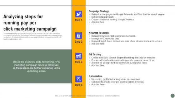 This slide provides glimpse about process of running Pay Per Click marketing campaign that help the businesses to boost conversion rate and increase Large Audiences. It includes steps such as campaign strategy, keyword research, A B testing, optimization, etc. Do you have to make sure that everyone on your team knows about any specific topic I yes, then you should give Analyzing Steps For Running Pay Exhaustive Guide Of Pay Per Click Advertising Initiative Introduction Pdf a try. Our experts have put a lot of knowledge and effort into creating this impeccable Analyzing Steps For Running Pay Exhaustive Guide Of Pay Per Click Advertising Initiative Introduction Pdf. You can use this template for your upcoming presentations, as the slides are perfect to represent even the tiniest detail. You can download these templates from the Slidegeeks website and these are easy to edit. So grab these today This slide provides glimpse about process of running Pay Per Click marketing campaign that help the businesses to boost conversion rate and increase Large Audiences. It includes steps such as campaign strategy, keyword research, A B testing, optimization, etc.