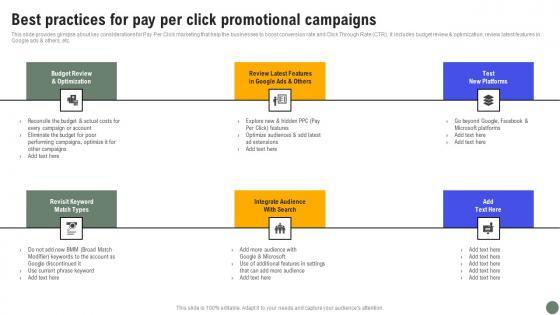 This slide provides glimpse about key considerations for Pay Per Click marketing that help the businesses to boost conversion rate and Click Through Rate CTR. It includes budget review and optimization, review latest features in Google ads and others, etc. Get a simple yet stunning designed Best Practices For Pay Per Click Exhaustive Guide Of Pay Per Click Advertising Initiative Pictures Pdf. It is the best one to establish the tone in your meetings. It is an excellent way to make your presentations highly effective. So, download this PPT today from Slidegeeks and see the positive impacts. Our easy to edit Best Practices For Pay Per Click Exhaustive Guide Of Pay Per Click Advertising Initiative Pictures Pdf can be your go to option for all upcoming conferences and meetings. So, what are you waiting for Grab this template today. This slide provides glimpse about key considerations for Pay Per Click marketing that help the businesses to boost conversion rate and Click Through Rate CTR. It includes budget review and optimization, review latest features in Google ads and others, etc.