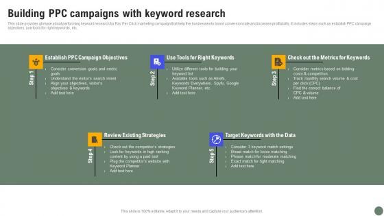 This slide provides glimpse about performing keyword research for Pay Per Click marketing campaign that help the businesses to boost conversion rate and increase profitability. It includes steps such as establish PPC campaign objectives, use tools for right keywords, etc. From laying roadmaps to briefing everything in detail, our templates are perfect for you. You can set the stage with your presentation slides. All you have to do is download these easy to edit and customizable templates. Building PPC Campaigns Exhaustive Guide Of Pay Per Click Advertising Initiatives Demonstration Pdf will help you deliver an outstanding performance that everyone would remember and praise you for. Do download this presentation today. This slide provides glimpse about performing keyword research for Pay Per Click marketing campaign that help the businesses to boost conversion rate and increase profitability. It includes steps such as establish PPC campaign objectives, use tools for right keywords, etc.