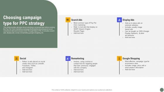This slide provides glimpse about selecting a campaign type before running the Pay Per Click marketing campaign that help the businesses to boost conversion rate and increase Click Through Rate CTR. It includes search ads, display ads, social, remarketing, google shopping, etc. Present like a pro with Choosing Campaign Type Exhaustive Guide Of Pay Per Click Advertising Initiatives Designs Pdf Create beautiful presentations together with your team, using our easy to use presentation slides. Share your ideas in real time and make changes on the fly by downloading our templates. So whether you are in the office, on the go, or in a remote location, you can stay in sync with your team and present your ideas with confidence. With Slidegeeks presentation got a whole lot easier. Grab these presentations today. This slide provides glimpse about selecting a campaign type before running the Pay Per Click marketing campaign that help the businesses to boost conversion rate and increase Click Through Rate CTR. It includes search ads, display ads, social, remarketing, google shopping, etc.