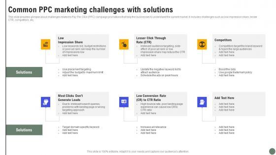 This slide provides glimpse about challenges related to Pay Per Click PPC campaign promotions that help the businesses to understand the current market. It includes challenges such as low impression share, lesser CTR, competitors, etc. Slidegeeks is here to make your presentations a breeze with Common PPC Marketing Exhaustive Guide Of Pay Per Click Advertising Initiatives Pictures Pdf With our easy to use and customizable templates, you can focus on delivering your ideas rather than worrying about formatting. With a variety of designs to choose from, you are sure to find one that suits your needs. And with animations and unique photos, illustrations, and fonts, you can make your presentation pop. So whether you are giving a sales pitch or presenting to the board, make sure to check out Slidegeeks first This slide provides glimpse about challenges related to Pay Per Click PPC campaign promotions that help the businesses to understand the current market. It includes challenges such as low impression share, lesser CTR, competitors, etc.