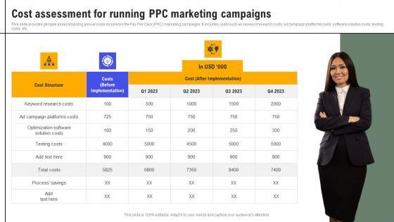 This slide provides glimpse about analyzing annual costs incurred in the Pay Per Click PPC marketing campaigns. It includes costs such as keyword research costs, ad campaign platforms costs, software solution costs, testing costs, etc. Find highly impressive Cost Assessment For Running Exhaustive Guide Of Pay Per Click Advertising Initiatives Rules Pdf on Slidegeeks to deliver a meaningful presentation. You can save an ample amount of time using these presentation templates. No need to worry to prepare everything from scratch because Slidegeeks experts have already done a huge research and work for you. You need to download Cost Assessment For Running Exhaustive Guide Of Pay Per Click Advertising Initiatives Rules Pdf for your upcoming presentation. All the presentation templates are 100 percent editable and you can change the color and personalize the content accordingly. Download now This slide provides glimpse about analyzing annual costs incurred in the Pay Per Click PPC marketing campaigns. It includes costs such as keyword research costs, ad campaign platforms costs, software solution costs, testing costs, etc.