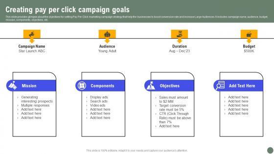 This slide provides glimpse about the objectives for setting Pay Per Click marketing campaign strategy that help the businesses to boost conversion rate and increase Large Audiences. It includes campaign name, audience, budget, mission, components, objectives, etc. If your project calls for a presentation, then Slidegeeks is your go to partner because we have professionally designed, easy to edit templates that are perfect for any presentation. After downloading, you can easily edit Creating Pay Per Click Campaign Exhaustive Guide Of Pay Per Click Advertising Initiatives Guidelines Pdf and make the changes accordingly. You can rearrange slides or fill them with different images. Check out all the handy templates This slide provides glimpse about the objectives for setting Pay Per Click marketing campaign strategy that help the businesses to boost conversion rate and increase Large Audiences. It includes campaign name, audience, budget, mission, components, objectives, etc.