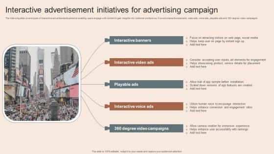 The following slide covers types of interactive advertisements aimed at enabling users engage with content to gain insights into customer preference. It covers interactive banners, video ads, voice ads, playable ads and 360 degree video campaigns. Showcasing this set of slides titled Interactive Advertisement Initiatives For Advertising Campaign. The topics addressed in these templates are Interactive Banners, Interactive Video Ads, Playable Ads. All the content presented in this PPT design is completely editable. Download it and make adjustments in color, background, font etc. as per your unique business setting. The following slide covers types of interactive advertisements aimed at enabling users engage with content to gain insights into customer preference. It covers interactive banners, video ads, voice ads, playable ads and 360 degree video campaigns.