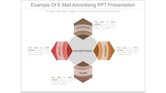 This is a example of e mail advertising ppt presentation. This is a four stage process. The stages in this process are attention, action, desire, interest, advertising.