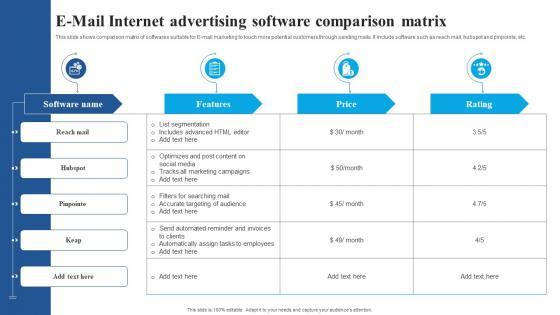 This slide shows comparison matrix of softwares suitable for E-mail marketing to touch more potential customers through sending mails. It include software such as reach mail, hubspot and pinpointe, etc.Pitch your topic with ease and precision using this E Mail Internet Advertising Software Comparison Matrix Pictures Pdf This layout presents information on Marketing Campaigns, Automated Reminder, Automatically Assign It is also available for immediate download and adjustment. So, changes can be made in the color, design, graphics or any other component to create a unique layout. This slide shows comparison matrix of softwares suitable for E mail marketing to touch more potential customers through sending mails. It include software such as reach mail, hubspot and pinpointe, etc.