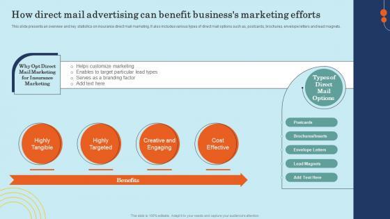 This slide presents an overview and key statistics on insurance direct mail marketing. It also includes various types of direct mail options such as, postcards, brochures, envelope letters and lead magnets.Crafting an eye-catching presentation has never been more straightforward. Let your presentation shine with this tasteful yet straightforward How Direct Mail Advertising Can Benefit Business Efforts Effective General Insurance Marketing Ideas Pdf template. It offers a minimalistic and classy look that is great for making a statement. The colors have been employed intelligently to add a bit of playfulness while still remaining professional. Construct the ideal How Direct Mail Advertising Can Benefit Business Efforts Effective General Insurance Marketing Ideas Pdf that effortlessly grabs the attention of your audience. Begin now and be certain to wow your customers. This slide presents an overview and key statistics on insurance direct mail marketing. It also includes various types of direct mail options such as, postcards, brochures, envelope letters and lead magnets.
