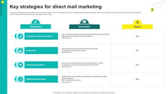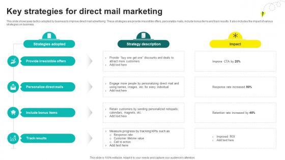 This slide showcases tactics adopted by business to improve direct mail advertising. These strategies are provide irresistible offers, personalize mails, include bonus items and track results. It also includes the impact of various strategies on business. Create an editable Key Strategies For Direct Mail Marketing One On One Advertising Strategy SS V that communicates your idea and engages your audience. Whether you are presenting a business or an educational presentation, pre-designed presentation templates help save time. Key Strategies For Direct Mail Marketing One On One Advertising Strategy SS V is highly customizable and very easy to edit, covering many different styles from creative to business presentations. Slidegeeks has creative team members who have crafted amazing templates. So, go and get them without any delay. This slide showcases tactics adopted by business to improve direct mail advertising. These strategies are provide irresistible offers, personalize mails, include bonus items and track results. It also includes the impact of various strategies on business.