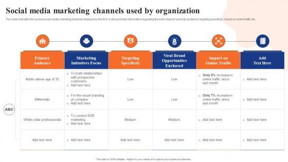 This slide indicates the current social media marketing channels deployed by the firm. It also provides information regarding the each channels primary audience, targeting specificity, impact on online traffic etc. This Digital Advertising Using Twitter Social Media Marketing Channels Used Mockup Pdf is perfect for any presentation, be it in front of clients or colleagues. It is a versatile and stylish solution for organizing your meetings. The Digital Advertising Using Twitter Social Media Marketing Channels Used Mockup Pdf features a modern design for your presentation meetings. The adjustable and customizable slides provide unlimited possibilities for acing up your presentation. Slidegeeks has done all the homework before launching the product for you. So, do not wait, grab the presentation templates today This slide indicates the current social media marketing channels deployed by the firm. It also provides information regarding the each channels primary audience, targeting specificity, impact on online traffic etc.