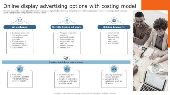 This slide provides the various options for marketers to purchase digital display advertisings along with price model. It includes options such as ad exchange, directly buying ad space, bidding keyword along with costing and suggestions. Explore a selection of the finest Online Display Advertising Options With Costing Model Ppt Model PDF here. With a plethora of professionally designed and pre made slide templates, you can quickly and easily find the right one for your upcoming presentation. You can use our Online Display Advertising Options With Costing Model Ppt Model PDF to effectively convey your message to a wider audience. Slidegeeks has done a lot of research before preparing these presentation templates. The content can be personalized and the slides are highly editable. Grab templates today from Slidegeeks.