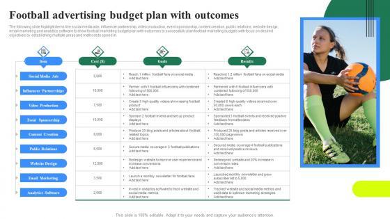 The following slide highlight items like social media ads, influencer partnership, video production, event sponsorship, content creation, public relations, website design, email marketing and analytics software to show football marketing budget plan with outcomes to successfully plan football marketing budgets with focus on desired objectives by establishing multiple areas and methods to spend in. Pitch your topic with ease and precision using this Football Advertising Budget Plan With Outcomes Elements Pdf This layout presents information on Social Media Ads, Influencer Partnerships, Video Production It is also available for immediate download and adjustment. So, changes can be made in the color, design, graphics or any other component to create a unique layout. The following slide highlight items like social media ads, influencer partnership, video production, event sponsorship, content creation, public relations, website design, email marketing and analytics software to show football marketing budget plan with outcomes to successfully plan football marketing budgets with focus on desired objectives by establishing multiple areas and methods to spend in.