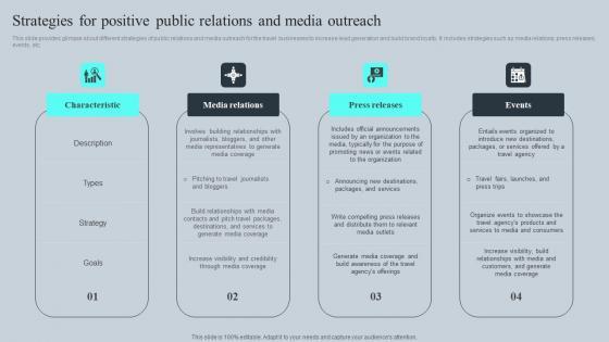 This slide provides glimpse about different strategies of public relations and media outreach for the travel businesses to increase lead generation and build brand loyalty. It includes strategies such as media relations, press releases, events, etc. Present like a pro with Strategies For Positive Public Relations Tours And Travel Business Advertising Infographics Pdf Create beautiful presentations together with your team, using our easy-to-use presentation slides. Share your ideas in real-time and make changes on the fly by downloading our templates. So whether you are in the office, on the go, or in a remote location, you can stay in sync with your team and present your ideas with confidence. With Slidegeeks presentation got a whole lot easier. Grab these presentations today. This slide provides glimpse about different strategies of public relations and media outreach for the travel businesses to increase lead generation and build brand loyalty. It includes strategies such as media relations, press releases, events, etc.