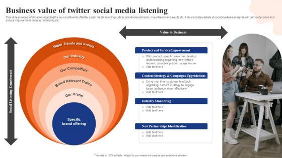 This slide provides information regarding the key constituents of twitter social media listening such as brand relevant topics, major trends and events etc. It also includes details of social media listening value in terms of product and service improvement, industry monitoring etc. Slidegeeks is one of the best resources for PowerPoint templates. You can download easily and regulate Social Media Advertising Through Twitter Business Value Of Twitter Social Media Listening Ideas PDF for your personal presentations from our wonderful collection. A few clicks is all it takes to discover and get the most relevant and appropriate templates. Use our Templates to add a unique zing and appeal to your presentation and meetings. All the slides are easy to edit and you can use them even for advertisement purposes.