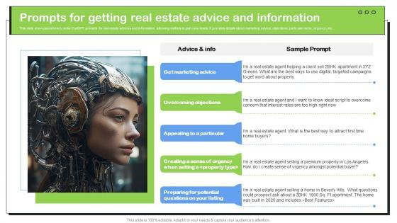 This slide showcases how to write ChatGPT prompts for real estate advices and information, allowing realtors to gain new leads. It provides details about marketing advice, objections, particular niche, urgency, etc. Want to ace your presentation in front of a live audience Our Transforming Real Estate Prompts For Getting Real Estate Advice And ChatGPT SS V can help you do that by engaging all the users towards you. Slidegeeks experts have put their efforts and expertise into creating these impeccable powerpoint presentations so that you can communicate your ideas clearly. Moreover, all the templates are customizable, and easy-to-edit and downloadable. Use these for both personal and commercial use. This slide showcases how to write ChatGPT prompts for real estate advices and information, allowing realtors to gain new leads. It provides details about marketing advice, objections, particular niche, urgency, etc.