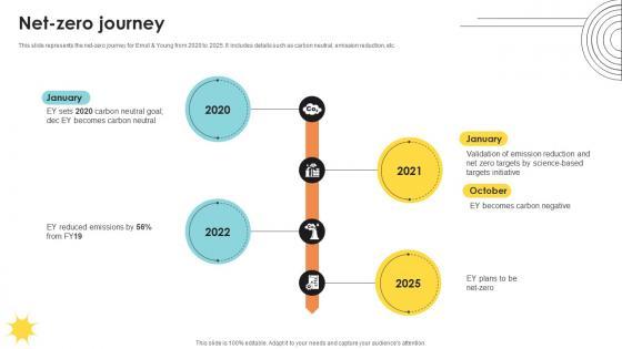This slide represents the net-zero journey for Ernst and Young from 2020 to 2025. It includes details such as carbon neutral, emission reduction, etc. Crafting an eye-catching presentation has never been more straightforward. Let your presentation shine with this tasteful yet straightforward Net Zero Journey Professional Services And Tax Advisory Company Profile CP SS V template. It offers a minimalistic and classy look that is great for making a statement. The colors have been employed intelligently to add a bit of playfulness while still remaining professional. Construct the ideal Net Zero Journey Professional Services And Tax Advisory Company Profile CP SS V that effortlessly grabs the attention of your audience Begin now and be certain to wow your customers This slide represents the net-zero journey for Ernst and Young from 2020 to 2025. It includes details such as carbon neutral, emission reduction, etc.