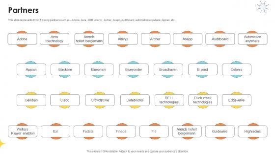This slide represents Ernst and Young partners such as Adobe, Aera, AHB, Alteryx, Archer, Asapp, Auditboard, automation anywhere, Appian, etc.Formulating a presentation can take up a lot of effort and time, so the content and message should always be the primary focus. The visuals of the PowerPoint can enhance the presenters message, so our Partners Professional Services And Tax Advisory Company Profile CP SS V was created to help save time. Instead of worrying about the design, the presenter can concentrate on the message while our designers work on creating the ideal templates for whatever situation is needed. Slidegeeks has experts for everything from amazing designs to valuable content, we have put everything into Partners Professional Services And Tax Advisory Company Profile CP SS V. This slide represents Ernst and Young partners such as Adobe, Aera, AHB, Alteryx, Archer, Asapp, Auditboard, automation anywhere, Appian, etc.