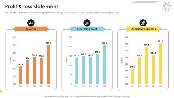 This slide represents the profit and loss statement highlights for Ernst and Young. It includes last 5 years revenue, operating profit, research and operating loss.Coming up with a presentation necessitates that the majority of the effort goes into the content and the message you intend to convey. The visuals of a PowerPoint presentation can only be effective if it supplements and supports the story that is being told. Keeping this in mind our experts created Profit And Loss Statement Professional Services And Tax Advisory Company Profile CP SS V to reduce the time that goes into designing the presentation. This way, you can concentrate on the message while our designers take care of providing you with the right template for the situation. This slide represents the profit and loss statement highlights for Ernst and Young. It includes last 5 years revenue, operating profit, research and operating loss.