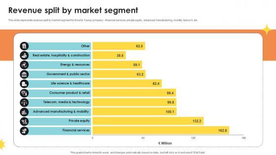 This slide represents revenue split by market segment for Ernst and Young company financial services, private equity, advanced manufacturing, mobility, telecom, etc.This Revenue Split By Market Segment Professional Services And Tax Advisory Company Profile CP SS V is perfect for any presentation, be it in front of clients or colleagues. It is a versatile and stylish solution for organizing your meetings. The Revenue Split By Market Segment Professional Services And Tax Advisory Company Profile CP SS V features a modern design for your presentation meetings. The adjustable and customizable slides provide unlimited possibilities for acing up your presentation. Slidegeeks has done all the homework before launching the product for you. So, do not wait, grab the presentation templates today This slide represents revenue split by market segment for Ernst and Young company financial services, private equity, advanced manufacturing, mobility, telecom, etc.