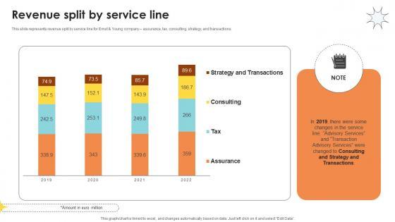 This slide represents revenue split by service line for Ernst and Young company assurance, tax, consulting, strategy, and transactions.Welcome to our selection of the Revenue Split By Service Line Professional Services And Tax Advisory Company Profile CP SS V. These are designed to help you showcase your creativity and bring your sphere to life. Planning and Innovation are essential for any business that is just starting out. This collection contains the designs that you need for your everyday presentations. All of our PowerPoints are 100 percent editable, so you can customize them to suit your needs. This multi-purpose template can be used in various situations. Grab these presentation templates today. This slide represents revenue split by service line for Ernst and Young company assurance, tax, consulting, strategy, and transactions.