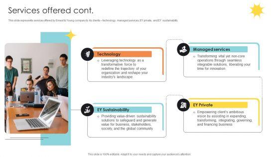 This slide represents services offered by EY to its clients strategy, consulting, people, workforce, transaction, corporate finance, and law.The best PPT templates are a great way to save time, energy, and resources. Slidegeeks have 100 percent editable powerpoint slides making them incredibly versatile. With these quality presentation templates, you can create a captivating and memorable presentation by combining visually appealing slides and effectively communicating your message. Download Services Offered Professional Services And Tax Advisory Company Profile CP SS V from Slidegeeks and deliver a wonderful presentation. This slide represents services offered by EY to its clients strategy, consulting, people, workforce, transaction, corporate finance, and law.