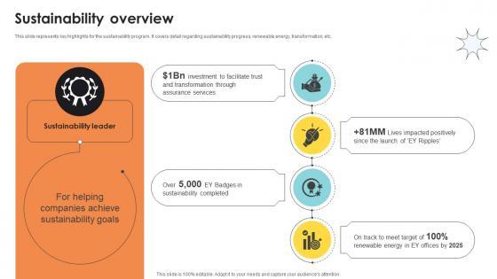 This slide represents key highlights for the sustainability program. It covers detail regarding sustainability progress, renewable energy, transformation, etc.Are you searching for a Sustainability Overview Professional Services And Tax Advisory Company Profile CP SS V that is uncluttered, straightforward, and original Its easy to edit, and you can change the colors to suit your personal or business branding. For a presentation that expresses how much effort you have put in, this template is ideal With all of its features, including tables, diagrams, statistics, and lists, its perfect for a business plan presentation. Make your ideas more appealing with these professional slides. Download Sustainability Overview Professional Services And Tax Advisory Company Profile CP SS V from Slidegeeks today. This slide represents key highlights for the sustainability program. It covers detail regarding sustainability progress, renewable energy, transformation, etc.