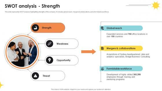 This slide represents SWOT analysis highlighting strengths of the company. It includes global reach, mergers and collaborations, and a formidable workforce.Slidegeeks has constructed Swot Analysis Strength Professional Services And Tax Advisory Company Profile CP SS V after conducting extensive research and examination. These presentation templates are constantly being generated and modified based on user preferences and critiques from editors. Here, you will find the most attractive templates for a range of purposes while taking into account ratings and remarks from users regarding the content. This is an excellent jumping-off point to explore our content and will give new users an insight into our top-notch PowerPoint Templates. This slide represents SWOT analysis highlighting strengths of the company. It includes global reach, mergers and collaborations, and a formidable workforce.