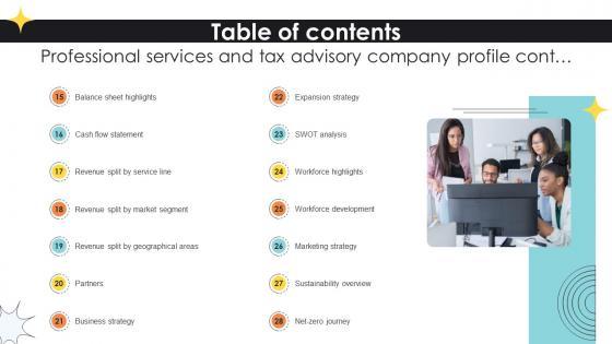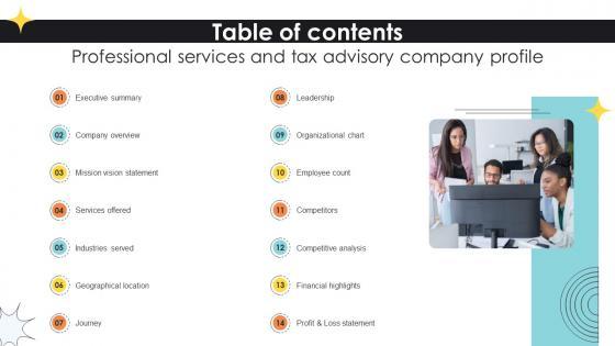 This Table Of Contents Professional Services And Tax Advisory Company Profile CP SS V from Slidegeeks makes it easy to present information on your topic with precision. It provides customization options, so you can make changes to the colors, design, graphics, or any other component to create a unique layout. It is also available for immediate download, so you can begin using it right away. Slidegeeks has done good research to ensure that you have everything you need to make your presentation stand out. Make a name out there for a brilliant performance. Our Table Of Contents Professional Services And Tax Advisory Company Profile CP SS V are topically designed to provide an attractive backdrop to any subject. Use them to look like a presentation pro.