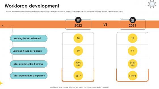 This slide represents workforce development overview highlighting learning hours delivered, learning hours per person, total investment in training, and total expenditure per person.Take your projects to the next level with our ultimate collection of Workforce Development Professional Services And Tax Advisory Company Profile CP SS V. Slidegeeks has designed a range of layouts that are perfect for representing task or activity duration, keeping track of all your deadlines at a glance. Tailor these designs to your exact needs and give them a truly corporate look with your own brand colors they will make your projects stand out from the rest This slide represents workforce development overview highlighting learning hours delivered, learning hours per person, total investment in training, and total expenditure per person.