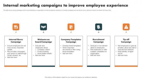 This slide shows various campaigns which can be started by an organization to enhance employee experience. It includes campaigns such as internal news, welcome on board, recruitment and many other. If your project calls for a presentation, then Slidegeeks is your go to partner because we have professionally designed, easy to edit templates that are perfect for any presentation. After downloading, you can easily edit Internal Marketing Campaigns Internal Branding Strategy For Enhanced Advocacy Structure Pdf and make the changes accordingly. You can rearrange slides or fill them with different images. Check out all the handy templates This slide shows various campaigns which can be started by an organization to enhance employee experience. It includes campaigns such as internal news, welcome on board, recruitment and many other.