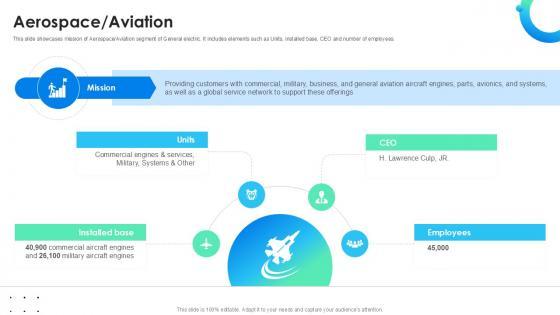 This slide showcases mission of Aerospace Aviation segment of General electric. It includes elements such as Units, installed base, CEO and number of employees. Find a pre-designed and impeccable Aerospace Aviation Military Aircraft Engine Manufacturing PPT PowerPoint CP SS V. The templates can ace your presentation without additional effort. You can download these easy-to-edit presentation templates to make your presentation stand out from others. So, what are you waiting for Download the template from Slidegeeks today and give a unique touch to your presentation. This slide showcases mission of Aerospace Aviation segment of General electric. It includes elements such as Units, installed base, CEO and number of employees.