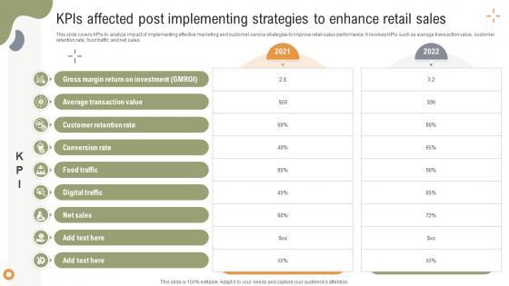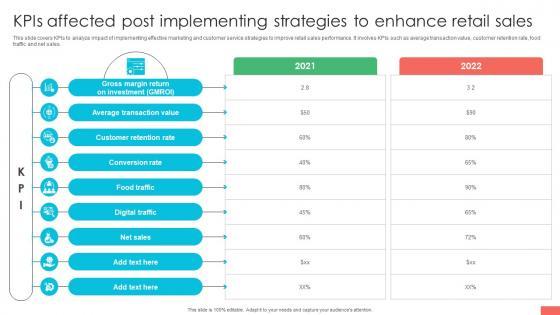 This slide covers KPIs to analyze impact of implementing effective marketing and customer service strategies to improve retail sales performance. It involves KPIs such as average transaction value, customer retention rate, food traffic and net sales. Are you searching for a Implementing Strategies To Enhance Kpis Affected Post Implementing Strategies To Enhance Retail that is uncluttered, straightforward, and original Its easy to edit, and you can change the colors to suit your personal or business branding. For a presentation that expresses how much effort you have put in, this template is ideal With all of its features, including tables, diagrams, statistics, and lists, its perfect for a business plan presentation. Make your ideas more appealing with these professional slides. Download Implementing Strategies To Enhance Kpis Affected Post Implementing Strategies To Enhance Retail from Slidegeeks today. This slide covers KPIs to analyze impact of implementing effective marketing and customer service strategies to improve retail sales performance. It involves KPIs such as average transaction value, customer retention rate, food traffic and net sales.