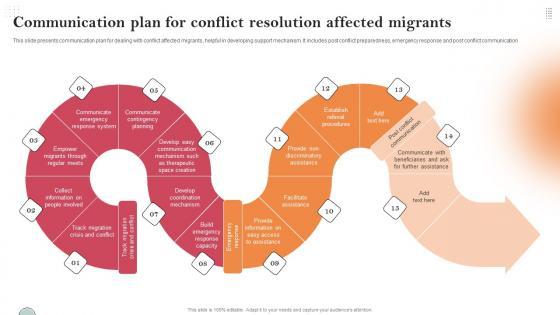 This slide presents communication plan for dealing with conflict affected migrants, helpful in developing support mechanism. It includes post conflict preparedness, emergency response and post conflict communication Pitch your topic with ease and precision using this Communication Plan For Conflict Resolution Affected Migrants Summary Pdf. This layout presents information on Track Migration Crisis Conflict, Communicate Contingency Planning, Develop Coordination Mechanism. It is also available for immediate download and adjustment. So, changes can be made in the color, design, graphics or any other component to create a unique layout. This slide presents communication plan for dealing with conflict affected migrants, helpful in developing support mechanism. It includes post conflict preparedness, emergency response and post conflict communication