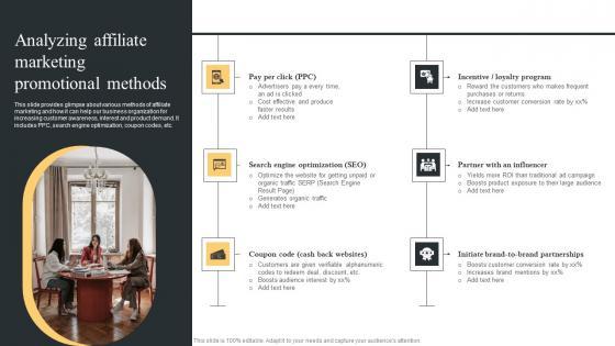 This slide provides glimpse about various methods of affiliate marketing and how it can help our business organization for increasing customer awareness, interest and product demand. It includes PPC, search engine optimization, coupon codes, etc. Slidegeeks is one of the best resources for PowerPoint templates. You can download easily and regulate Analyzing Affiliate Marketing Comprehensive Guide For Paid Media Marketing Strategies Themes Pdf for your personal presentations from our wonderful collection. A few clicks is all it takes to discover and get the most relevant and appropriate templates. Use our Templates to add a unique zing and appeal to your presentation and meetings. All the slides are easy to edit and you can use them even for advertisement purposes. This slide provides glimpse about various methods of affiliate marketing and how it can help our business organization for increasing customer awareness, interest and product demand. It includes PPC, search engine optimization, coupon codes, etc.