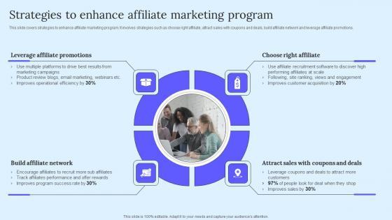 This slide covers strategies to enhance affiliate marketing program. It involves strategies such as choose right affiliate, attract sales with coupons and deals, build affiliate network and leverage affiliate promotions. Crafting an eye catching presentation has never been more straightforward. Let your presentation shine with this tasteful yet straightforward Strategies To Enhance Affiliate Marketing B2B Marketing Techniques To Attract Potential Themes Pdf template. It offers a minimalistic and classy look that is great for making a statement. The colors have been employed intelligently to add a bit of playfulness while still remaining professional. Construct the ideal Strategies To Enhance Affiliate Marketing B2B Marketing Techniques To Attract Potential Themes Pdf that effortlessly grabs the attention of your audience Begin now and be certain to wow your customers This slide covers strategies to enhance affiliate marketing program. It involves strategies such as choose right affiliate, attract sales with coupons and deals, build affiliate network and leverage affiliate promotions.