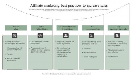 Following slide showcases affiliate marketing best practices that help companies to improve online sales and customer base. It include pointers such as prepare plan, select right affiliates, set terms and conditions, use cross promotions etc. Following slide showcases affiliate marketing best practices that help companies to improve online sales and customer base. It include pointers such as prepare plan, select right affiliates, set terms and conditions, use cross promotions etc. Find a pre-designed and impeccable Affiliate Marketing Best Practices To Increase Sales Efficient Marketing Tactics Summary Pdf. The templates can ace your presentation without additional effort. You can download these easy-to-edit presentation templates to make your presentation stand out from others. So, what are you waiting for Download the template from Slidegeeks today and give a unique touch to your presentation. Following slide showcases affiliate marketing best practices that help companies to improve online sales and customer base. It include pointers such as prepare plan, select right affiliates, set terms and conditions, use cross promotions etc.