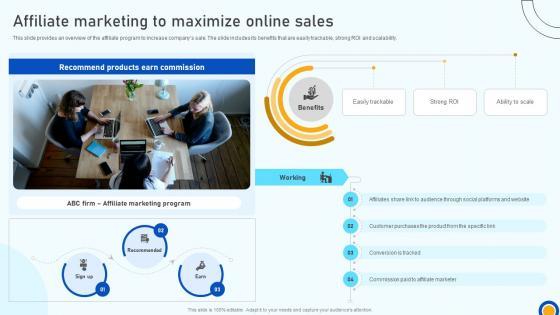 This slide provides an overview of the affiliate program to increase companys sale. The slide includes its benefits that are easily trackable, strong ROI and scalability. Boost your pitch with our creative Building Stronger Customer Affiliate Marketing To Maximize Online Sales SA SS V. Deliver an awe-inspiring pitch that will mesmerize everyone. Using these presentation templates you will surely catch everyones attention. You can browse the ppts collection on our website. We have researchers who are experts at creating the right content for the templates. So you do not have to invest time in any additional work. Just grab the template now and use them. This slide provides an overview of the affiliate program to increase companys sale. The slide includes its benefits that are easily trackable, strong ROI and scalability.