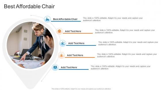 Introducing our well-designed Best Affordable Chair In Powerpoint And Google Slides Cpb This PowerPoint design presents information on topics like Best Affordable Chair As it is predesigned it helps boost your confidence level. It also makes you a better presenter because of its high-quality content and graphics. This PPT layout can be downloaded and used in different formats like PDF, PNG, and JPG. Not only this, it is available in both Standard Screen and Widescreen aspect ratios for your convenience. Therefore, click on the download button now to persuade and impress your audience. Our Best Affordable Chair In Powerpoint And Google Slides Cpb are topically designed to provide an attractive backdrop to any subject. Use them to look like a presentation pro.