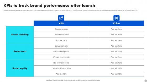 This slide showcases KPIs that can help organization to track and evaluate the performance of brand in the market. Metrics are social mentions, customer reviews, conversion rate, email subscriptions, website bounce rate, net promoter score etc Are you searching for a Kpis To Track Brand Performance After Launch Launching New Product Brand Brochure Pdf that is uncluttered, straightforward, and original It is easy to edit, and you can change the colors to suit your personal or business branding. For a presentation that expresses how much effort you have put in, this template is ideal With all of its features, including tables, diagrams, statistics, and lists, it is perfect for a business plan presentation. Make your ideas more appealing with these professional slides. Download Kpis To Track Brand Performance After Launch Launching New Product Brand Brochure Pdf from Slidegeeks today. This slide showcases KPIs that can help organization to track and evaluate the performance of brand in the market. Metrics are social mentions, customer reviews, conversion rate, email subscriptions, website bounce rate, net promoter score etc