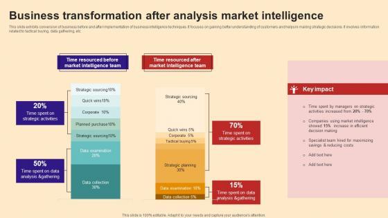 This slide exhibits conversion of business before and after implementation of business intelligence techniques. It focuses on gaining better understanding of customers and helps in making strategic decisions. It involves information related to tactical buying, data gathering, etc.Pitch your topic with ease and precision using this Business Transformation After Analysis Market Intelligence Demonstration Pdf This layout presents information on Decision Making, Managers Strategic, Activities Increased It is also available for immediate download and adjustment. So, changes can be made in the color, design, graphics or any other component to create a unique layout. This slide exhibits conversion of business before and after implementation of business intelligence techniques. It focuses on gaining better understanding of customers and helps in making strategic decisions. It involves information related to tactical buying, data gathering, etc.
