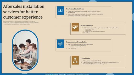 This slide covers various software installation services for customers, such as unattended installations, in-place upgrades, remote network installations, and clean installs. Make sure to capture your audiences attention in your business displays with our gratis customizable Increasing Customer Aftersales Installation Services For Better Customer Experience Inspiration PDF. These are great for business strategies, office conferences, capital raising or task suggestions. If you desire to acquire more customers for your tech business and ensure they stay satisfied, create your own sales presentation with these plain slides.