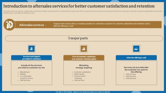 This slide covers an overview of aftersales services for a better client experience. It includes three major parts of the concept, which as services and support provided to the customers, part of the customer satisfaction and customer retention policy, and after the offering is sold. Formulating a presentation can take up a lot of effort and time, so the content and message should always be the primary focus. The visuals of the PowerPoint can enhance the presenters message, so our Ultimate Guide To Improve Customer Support And Services Introduction To Aftersales Services Better Customer Download PDF was created to help save time. Instead of worrying about the design, the presenter can concentrate on the message while our designers work on creating the ideal templates for whatever situation is needed. Slidegeeks has experts for everything from amazing designs to valuable content, we have put everything into Ultimate Guide To Improve Customer Support And Services Introduction To Aftersales Services Better Customer Download PDF