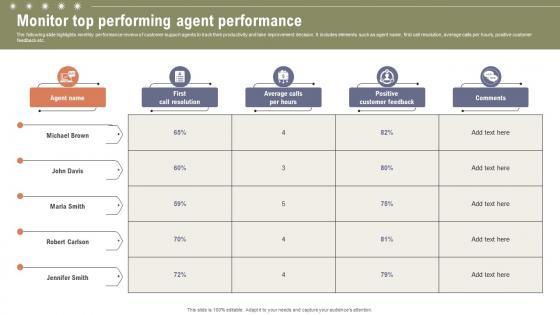 The following slide highlights monthly performance review of customer support agents to track their productivity and take improvement decision. It includes elements such as agent name, first call resolution, average calls per hours, positive customer feedback etc. Welcome to our selection of the Monitor Top Performing Agent Enhancing Customer Experience Ppt Example. These are designed to help you showcase your creativity and bring your sphere to life. Planning and Innovation are essential for any business that is just starting out. This collection contains the designs that you need for your everyday presentations. All of our PowerPoints are 100Percent editable, so you can customize them to suit your needs. This multi-purpose template can be used in various situations. Grab these presentation templates today. The following slide highlights monthly performance review of customer support agents to track their productivity and take improvement decision. It includes elements such as agent name, first call resolution, average calls per hours, positive customer feedback etc.