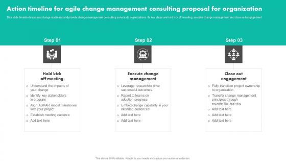 This slide timeline to assess change readiness and provide change management consulting services to organizations. Its key steps are hold kick off meeting, execute change management and close out engagement. Stand out from the crowd with our dynamic Action Timeline For Agile Change Management Consulting Proposal For Organization Brochure PDF template. Designed to help you make a statement, this single-slide PPT template is fully customizable to suit your unique needs. With eye-catching visuals and seamless editing options, you can create impactful presentations in minutes. Say goodbye to boring slides and unlock your presentation potential with our top-notch template. This slide timeline to assess change readiness and provide change management consulting services to organizations. Its key steps are hold kick off meeting, execute change management and close out engagement.