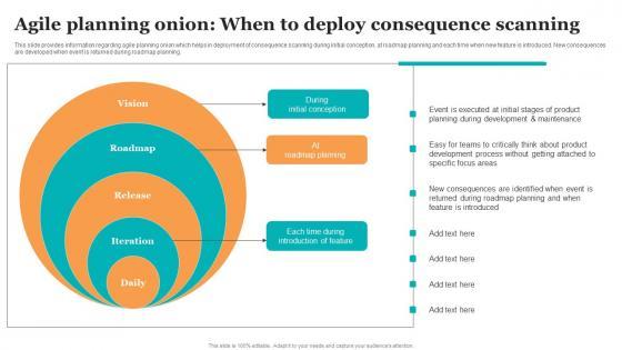 This slide provides information regarding agile planning onion which helps in deployment of consequence scanning during initial conception, at roadmap planning and each time when new feature is introduced. New consequences are developed when event is returned during roadmap planning. Slidegeeks is one of the best resources for PowerPoint templates. You can download easily and regulate Playbook To Remediate False Agile Planning Onion When To Deploy Structure Pdf for your personal presentations from our wonderful collection. A few clicks is all it takes to discover and get the most relevant and appropriate templates. Use our Templates to add a unique zing and appeal to your presentation and meetings. All the slides are easy to edit and you can use them even for advertisement purposes. This slide provides information regarding agile planning onion which helps in deployment of consequence scanning during initial conception, at roadmap planning and each time when new feature is introduced. New consequences are developed when event is returned during roadmap planning.