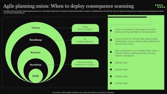 This slide provides information regarding agile planning onion which helps in deployment of consequence scanning during initial conception, at roadmap planning and each time when new feature is introduced. New consequences are developed when event is returned during roadmap planning. Find a pre designed and impeccable Agile Planning Onion When To Deploy Consequence Scanning Ppt File Tips PDF. The templates can ace your presentation without additional effort. You can download these easy to edit presentation templates to make your presentation stand out from others. So, what are you waiting for Download the template from Slidegeeks today and give a unique touch to your presentation.