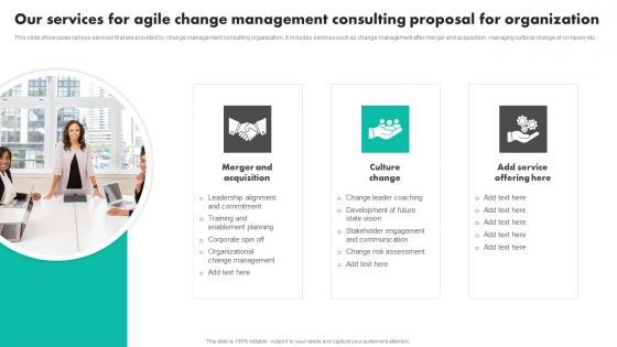 This slide showcases various services that are provided by change management consulting organization. It includes services such as change management after merger and acquisition, managing cultural change of company etc. Power up your presentations with our Our Services For Agile Change Management Consulting Proposal For Organization Download PDF single-slide PPT template. Our visually-stunning template will help you deliver your message with confidence. With easy-to-use editing options and fully customizable features, you can create polished and captivating presentations in no time. Say goodbye to boring slides and hello to impactful presentations with our top-quality template. Download now and get ready to wow your audience. singles This slide showcases various services that are provided by change management consulting organization. It includes services such as change management after merger and acquisition, managing cultural change of company etc