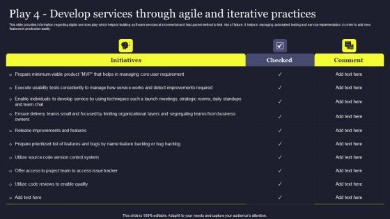 This slide provides information regarding digital services play which helps in building software services at incremental and fast-paced method to limit risk of failure. It helps in managing automated testing and service implementation in order to add new features in production easily. Make sure to capture your audiences attention in your business displays with our gratis customizable Play 4 Develop Services Through Agile And Iterative Practices Playbook For Managing Us Information Pdf. These are great for business strategies, office conferences, capital raising or task suggestions. If you desire to acquire more customers for your tech business and ensure they stay satisfied, create your own sales presentation with these plain slides. This slide provides information regarding digital services play which helps in building software services at incremental and fastpaced method to limit risk of failure. It helps in managing automated testing and service implementation in order to add new features in production easily.