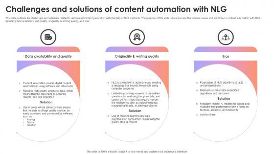 This slide outlines the challenges and solutions related to automated content generation with the help of NLG methods. The purpose of this slide is to showcase the various issues and solutions to content automation with NLG, including data availability and quality, originality and writing quality, and bias. Whether you have daily or monthly meetings, a brilliant presentation is necessary. Challenges And Solutions Of Content Automation With NLG AI Content Creation It Ppt Example can be your best option for delivering a presentation. Represent everything in detail using Challenges And Solutions Of Content Automation With NLG AI Content Creation It Ppt Example and make yourself stand out in meetings. The template is versatile and follows a structure that will cater to your requirements. All the templates prepared by Slidegeeks are easy to download and edit. Our research experts have taken care of the corporate themes as well. So, give it a try and see the results. This slide outlines the challenges and solutions related to automated content generation with the help of NLG methods. The purpose of this slide is to showcase the various issues and solutions to content automation with NLG, including data availability and quality, originality and writing quality, and bias.