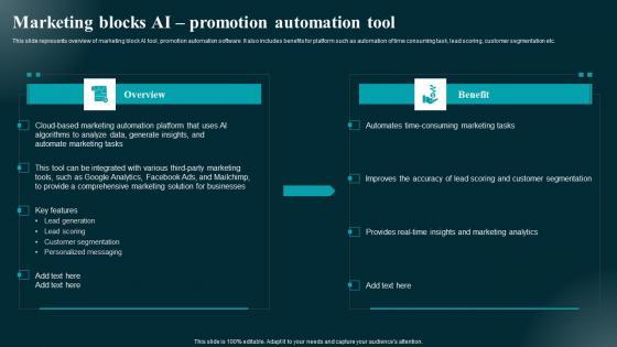 This slide represents overview of marketing block AI tool, promotion automation software. It also includes benefits for platform such as automation of time consuming task, lead scoring, customer segmentation etc. Slidegeeks is here to make your presentations a breeze with Marketing Blocks AI Promotion Automation Tool Applications And Impact Ideas Pdf With our easy-to-use and customizable templates, you can focus on delivering your ideas rather than worrying about formatting. With a variety of designs to choose from, you are sure to find one that suits your needs. And with animations and unique photos, illustrations, and fonts, you can make your presentation pop. So whether you are giving a sales pitch or presenting to the board, make sure to check out Slidegeeks first This slide represents overview of marketing block AI tool, promotion automation software. It also includes benefits for platform such as automation of time consuming task, lead scoring, customer segmentation etc.